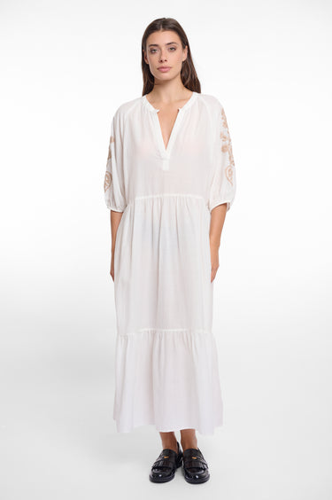 Ontdek de belichaming van bohemian chic met deze maxi-jurk van Rino Pelle met ingewikkelde borduurdetails en een gelaagde uitstraling. Dit verbluffende stuk wordt geleverd met een binnenjurk voor extra comfort. De pofshortmouwen en flatterende V-hals zorgen voor een stijlvolle en elegante silhouet. Materiaal: 65% Katoen en 35% Viscose.