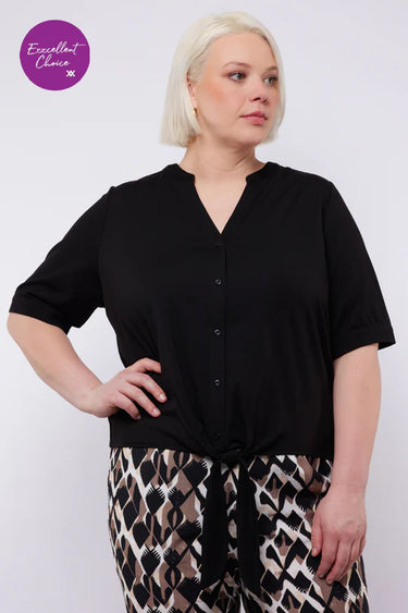 De Arlette blouse is een tijdloze top met een elegante, minimalistische uitstraling. De blouse heeft korte mouwen, een knoopsluiting en een speelse knoopdetail aan de onderkant. De lichte stretchstof zorgt voor een comfortabele pasvorm en maakt het eenvoudig te combineren met verschillende outfits.