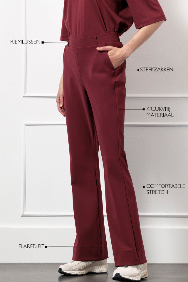 De Flair bonded trousers van Studio Anneloes is een elegante broek met een flared fit en een comfortabele high-waist taille. In de rijke kleur Bordeaux is dit een stijlvol item dat vrouwelijkheid en draagcomfort perfect combineert. Gemaakt van onze stevige Bonded Travelstof, biedt deze broek een flatterende pasvorm die mooi in model blijft, de hele dag door.