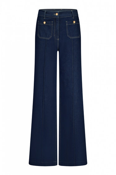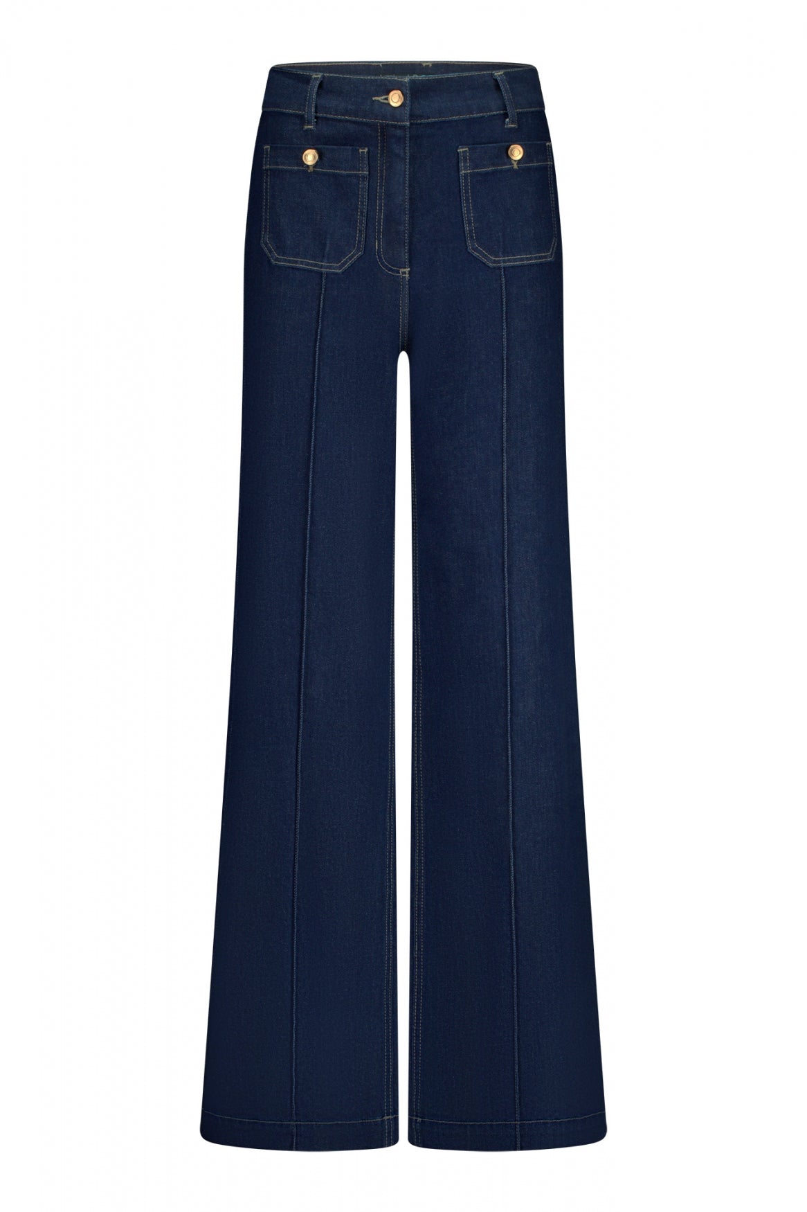 Een jeans van Label Dot met de uitstraling van een pantalon: dat is wat ons betreft het beste van twee werelden. Het rechte model springt in het oog door de opgestikte zakken, goudkleurige knopen en persplooi. Riemlussen en paspelzakken aan de achterkant maken het item af. Materiaal: 98% Katoen, 2% Elastane.