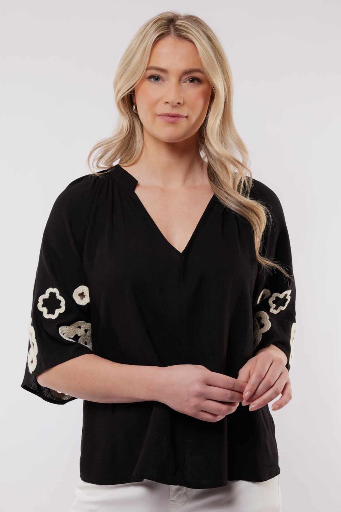 De Braga top heeft een losvallende pasvorm en is heerlijk luchtig, waardoor het de perfecte keuze is voor warme dagen. De V-hals en het subtiele borduursel op de mouwen voegen een verfijnde touch toe, terwijl het tijdloze ontwerp je eindeloos laat combineren. Materiaal: 70% Katoen en 30% Linnen.
