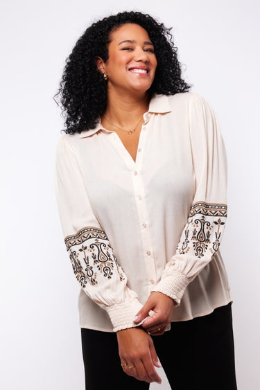 De Cassandra blouse is een elegante blouse met een klassieke kraag en knoopsluiting. De mouwen hebben opvallende geborduurde details in een etnisch geïnspireerd patroon, gecombineerd met subtiele plooien voor een vrouwelijke uitstraling. De manchetten zijn afgewerkt met elastiek, waardoor ze een licht gepoft effect krijgen. Perfect om een vleugje verfijning toe te voegen aan je outfit.