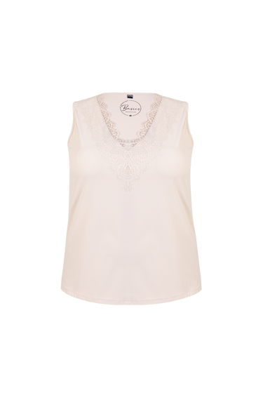 De Elsa top is een veelzijdige basic die perfect is voor het voorjaarsseizoen, maar ook het hele jaar door gedragen kan worden. De top heeft een mouwloos design, een elegante V-hals en een verfijnd kanten detail, wat het een vrouwelijke en tijdloze uitstraling geeft. Materiaal: Polyamide 75%, Elastane 25%