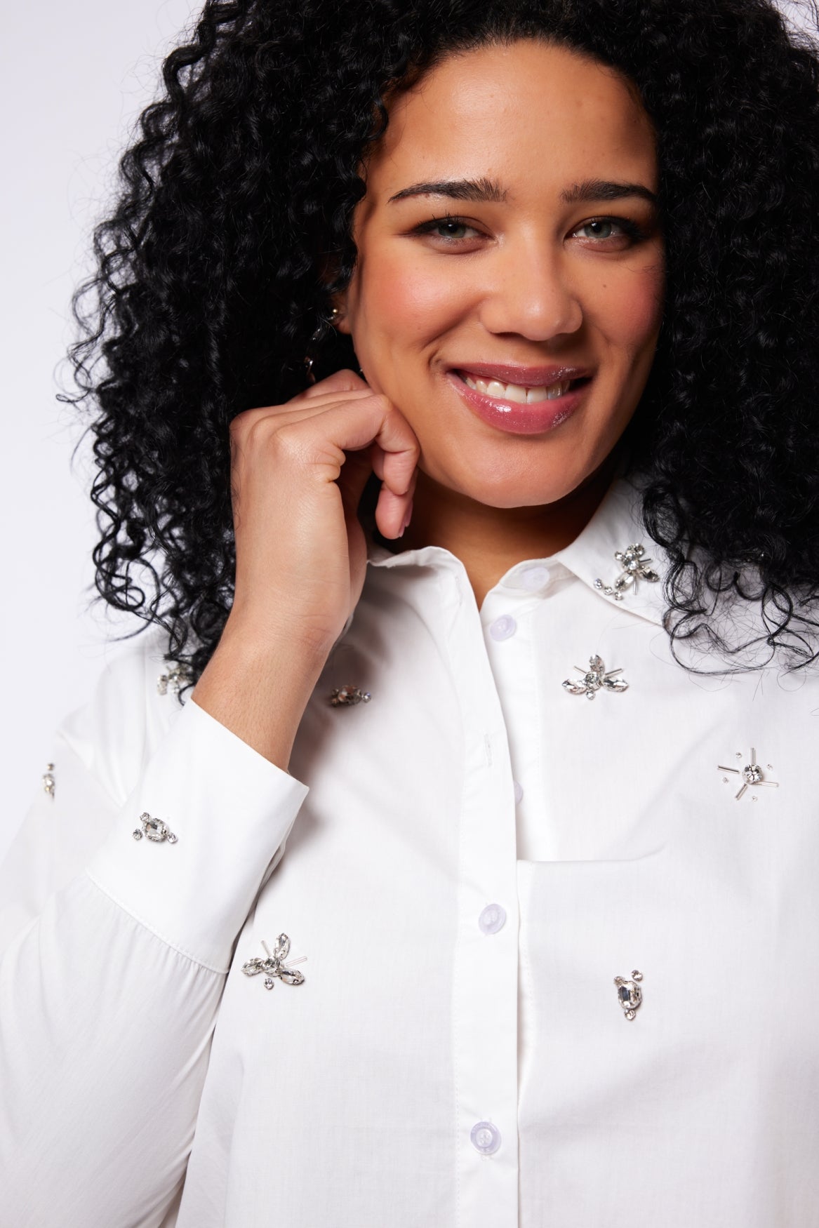 De Jessie blouse geeft een speelse touch aan je outfit. De klassieke zwarte stof is versierd met subtiele stras steentjes, waardoor het een chique uitstraling krijgt. De lange mouwen en knoopsluiting zorgen voor een klassieke look, ideaal voor zowel casual als feestelijke gelegenheden. Materiaal: 100% Katoen.