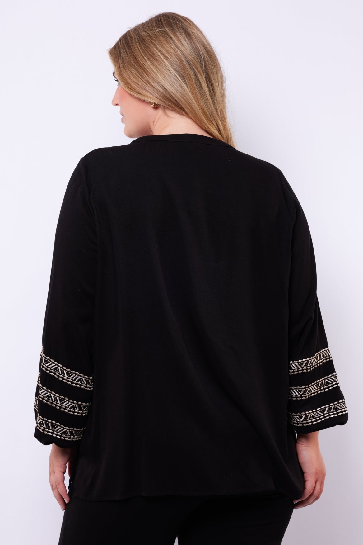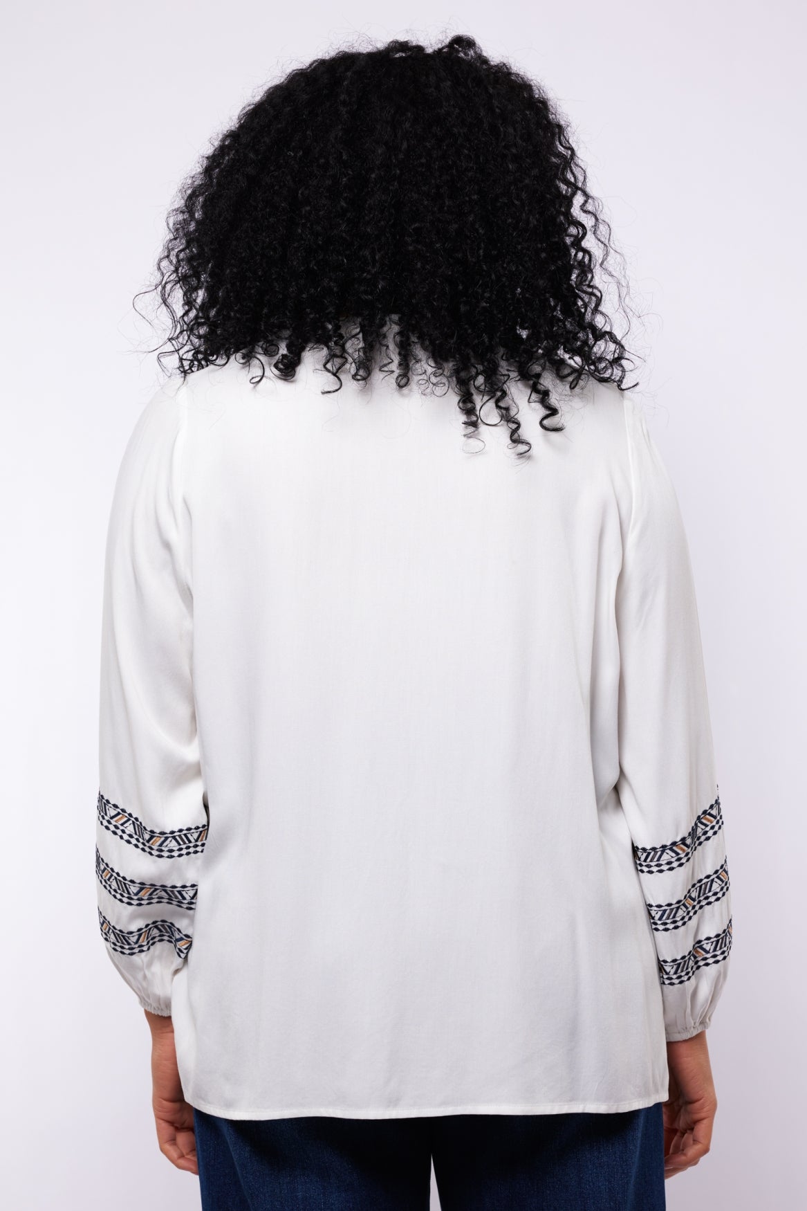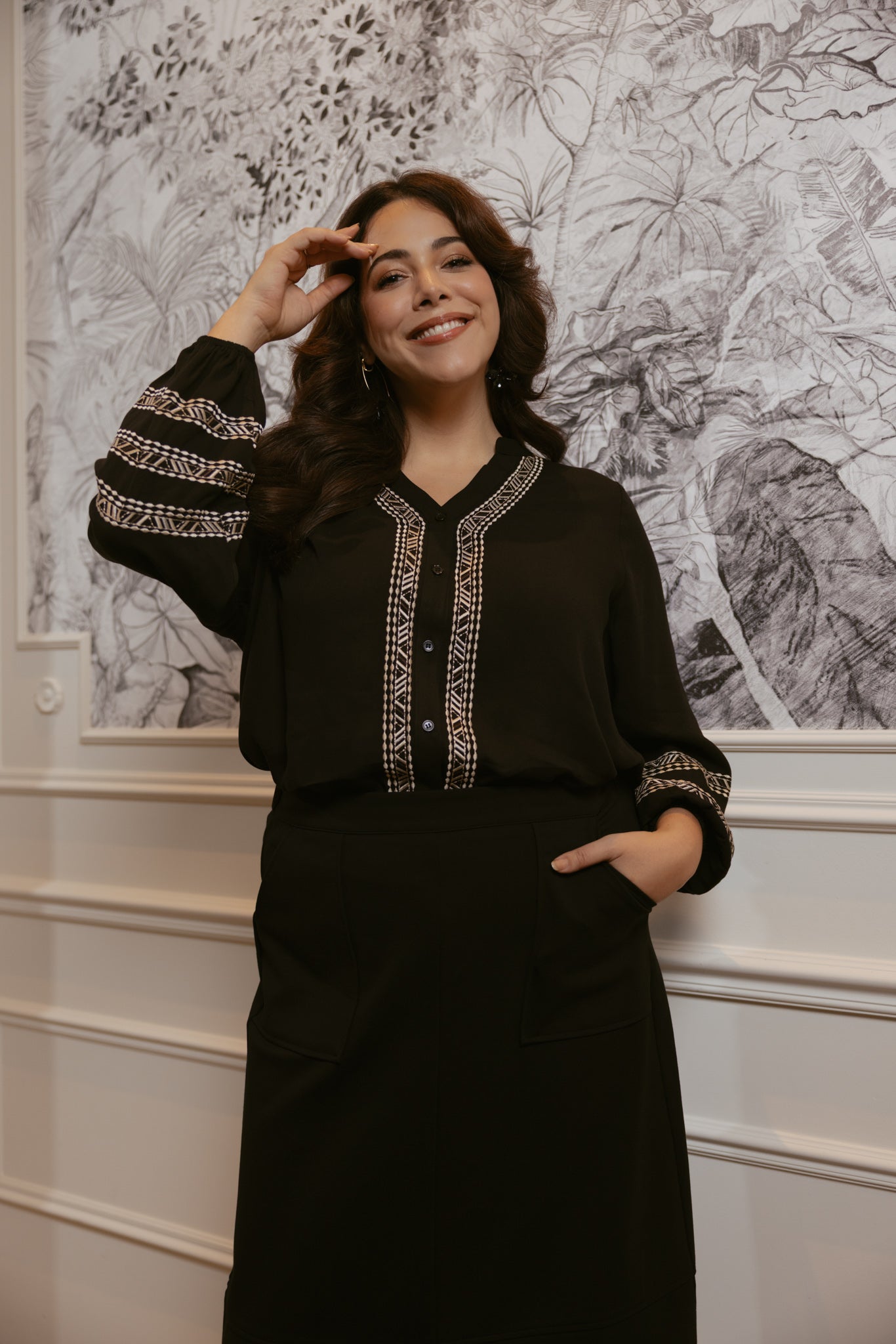 De subtiele borduursels langs de V-hals en mouwen geven de Kallie blouse een speelse twist, terwijl de luchtige stof zorgt voor een fijne pasvorm. De knoopsluiting maakt het een veelzijdig item dat zowel open als dicht gedragen kan worden.