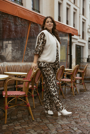 De Nikkie panterprint pants is een prachtige flair broek. Erg mooi te combineren met de Tammy Top. Materiaal: 100% Polyester.