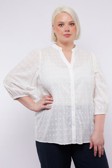 De Rafaela blouse is gemaakt van lichte, ademende stof met een subtiele stippenstructuur, perfect voor elke gelegenheid. De 3/4-mouwen met elastische boorden zorgen voor een speelse touch, terwijl de V-hals en knoopsluiting een verfijnde uitstraling bieden.