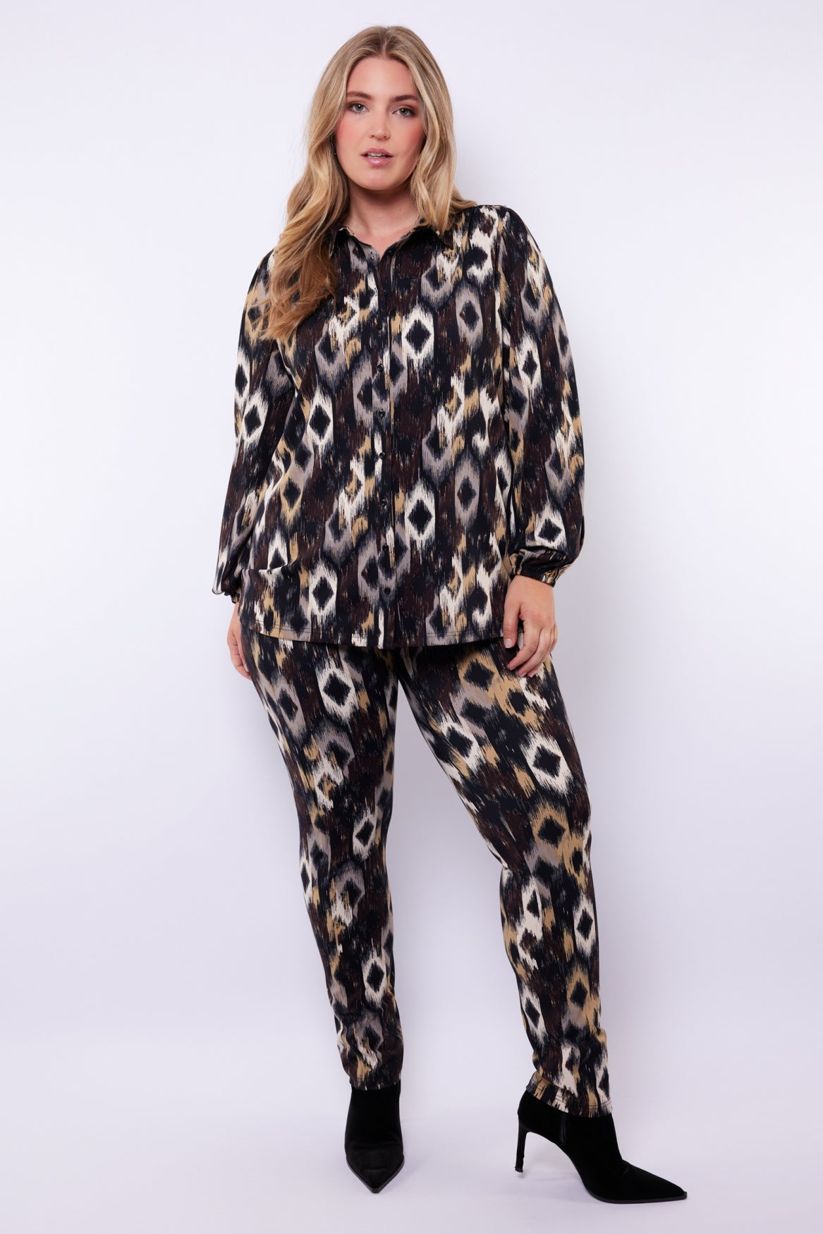 Ga voor bold met de Tonya printbroek in een rijke mix van bruin, zwart en beige. De elastische tailleband zorgt voor comfort, terwijl de slanke pijp zorgt voor een moderne fit. Draag met een effen top of als set met de bijpassende Tiana top voor een statement look.