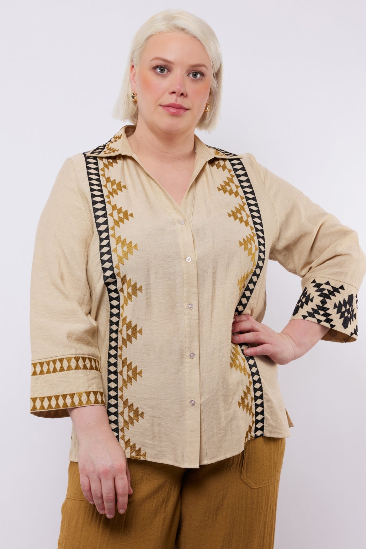 De Ylenia blouse is een stijlvolle en veelzijdige blouse met een etnisch geïnspireerd patroon. Gemaakt van luchtige, lichtgewicht stof, biedt het een comfortabele pasvorm. De blouse heeft een knoopsluiting aan de voorkant, driekwart mouwen en subtiele details die het ontwerp een speelse touch geven.