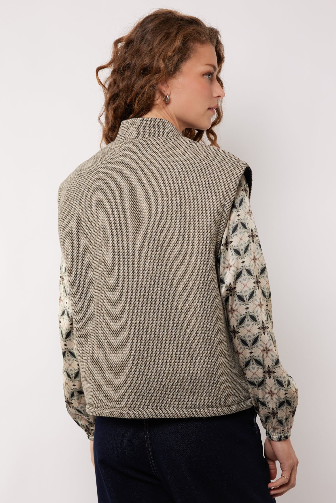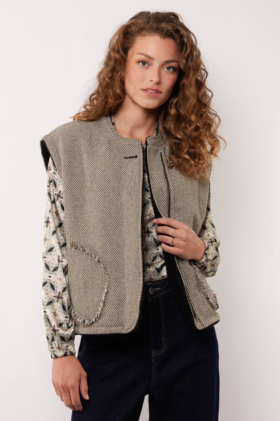 De Kamala gilet voegt een stijlvolle touch toe aan iedere outfit. Dit mouwloze item is uitgevoerd in een verfijnde geweven stof met een subtiel visgraatpatroon. De sierlijke randen en het opvallende knoopdetail bij de hals geven het gilet een elegante uitstraling. De afgeronde zakken aan de voorzijde zorgen voor een speelse twist. Een persoonlijke favoriet van Froukje uit haar collectie.
