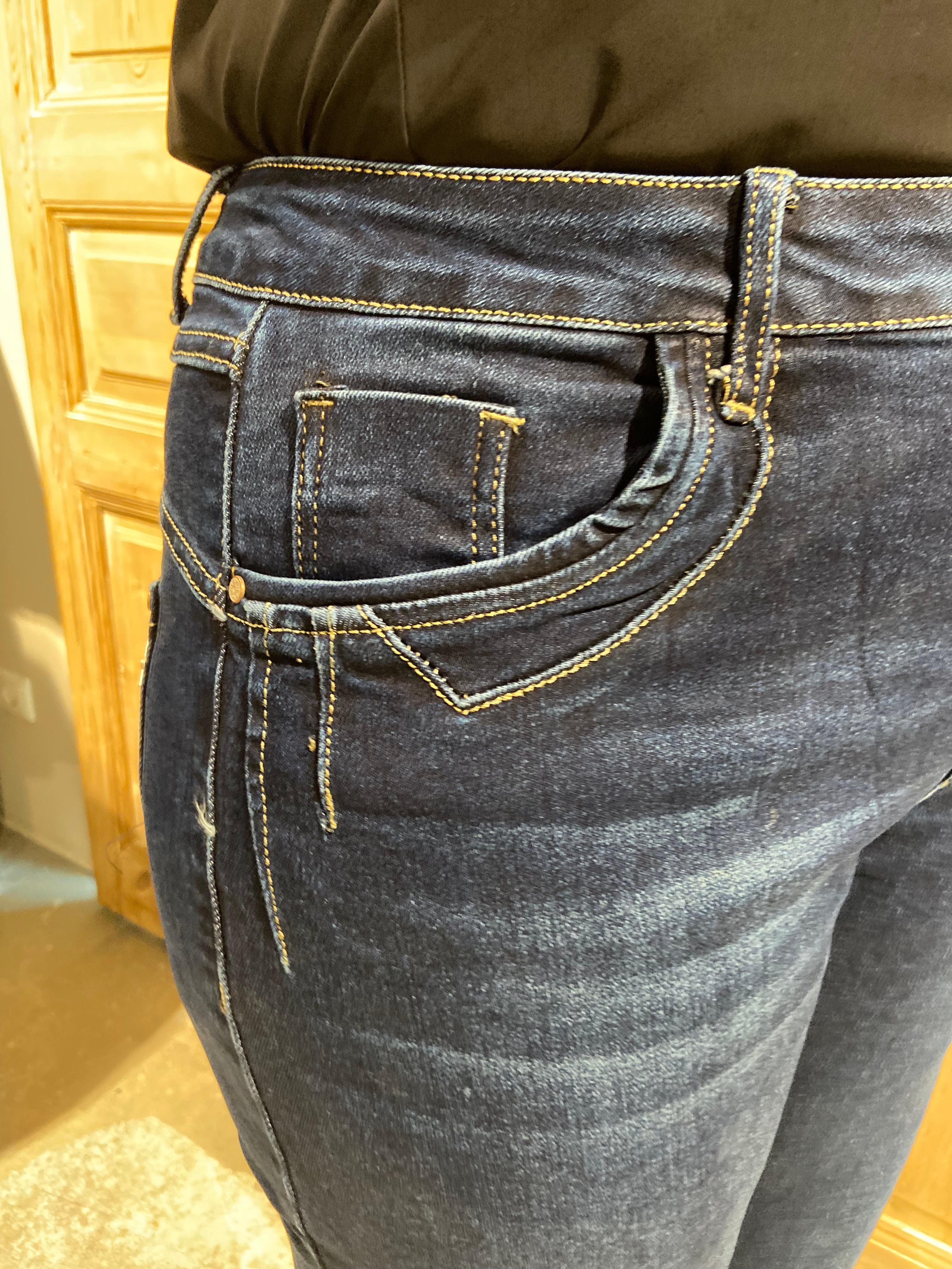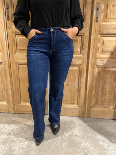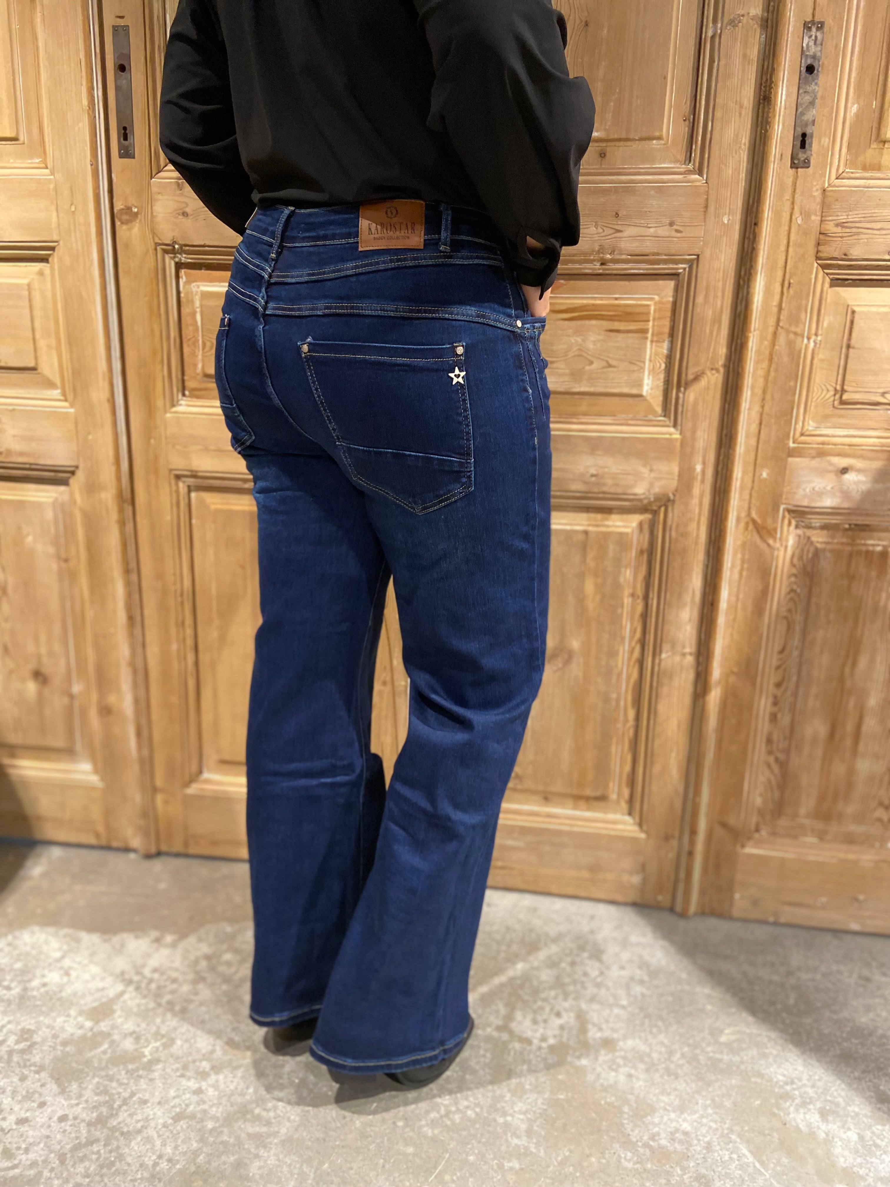 Mooie blauwe jeans van Karostar koop je bij Sandra's Boetiek! De Karostar jeans zijn flared, hebben een mooie pasvorm en een leuk detail bij de zakken.