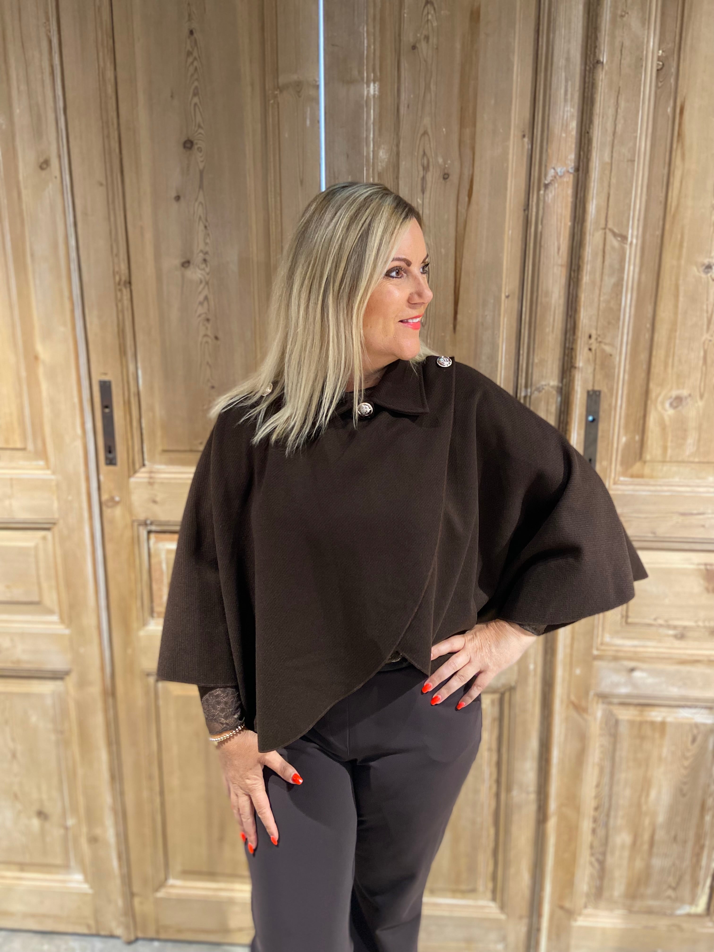 Dit mooie cape jasje past van maat 34 t/m 44.
