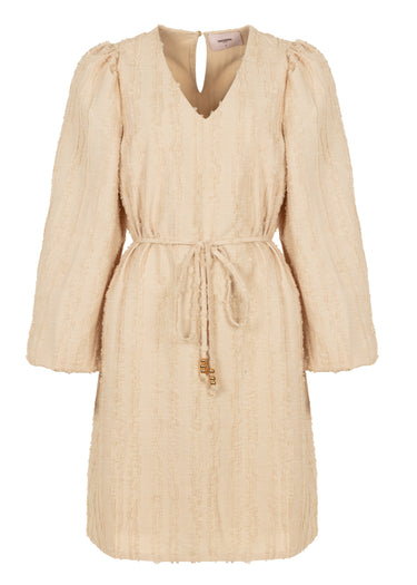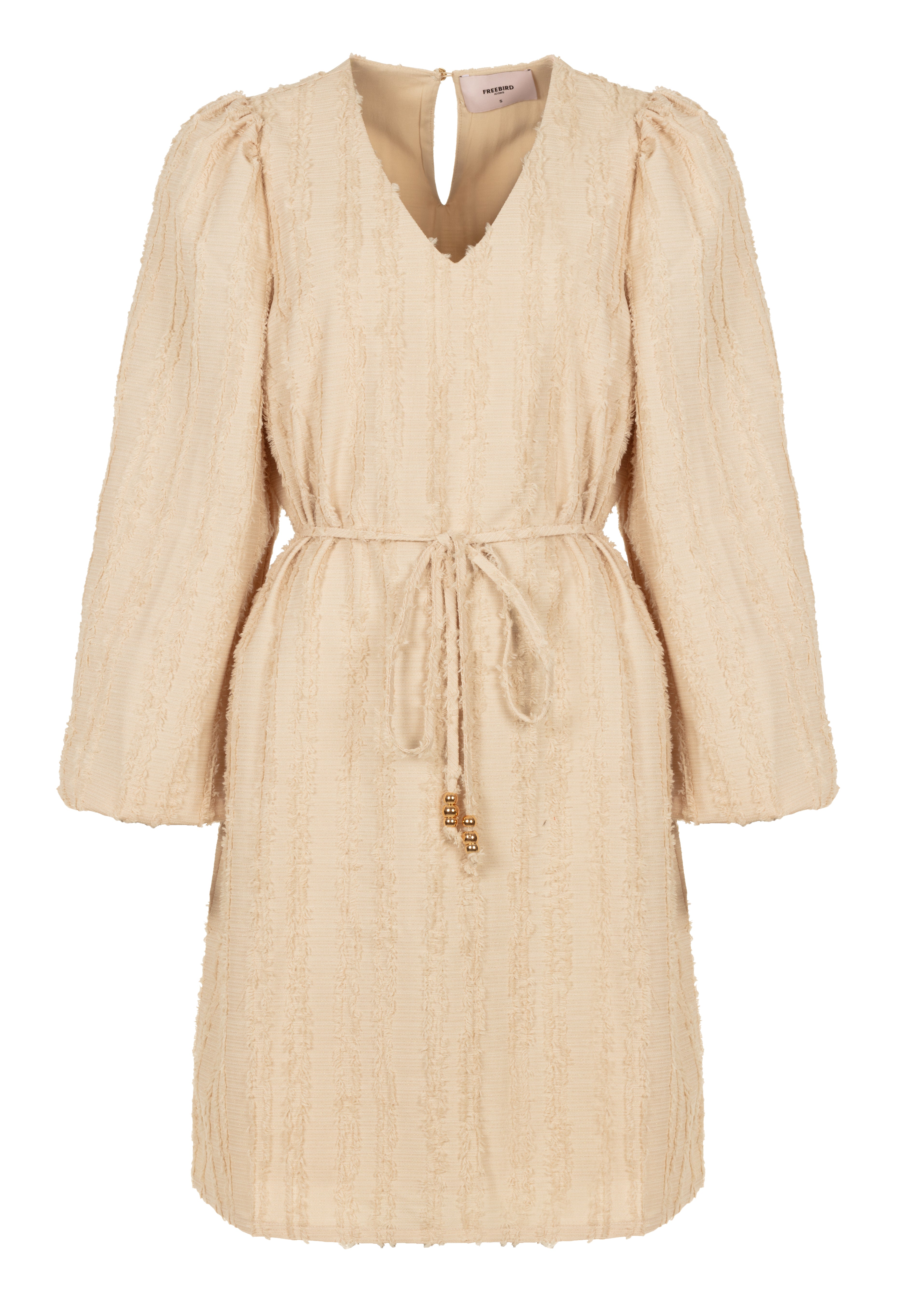 Deze speelse korte jurkje is gemaakt van een chique stof met fijne haartjes die een zachte, rijke textuur creëren. De ballonmouwen geven het silhouet een moderne en vrouwelijke uitstraling, terwijl de bijpassende riem van dezelfde stof de taille elegant accentueert. Of je hem nu combineert met hakken of laarzen, deze jurk is perfect voor een chique dagje uit of een feestelijke gelegenheid. Stofsamenstelling: 65% polyester, 35% viscose