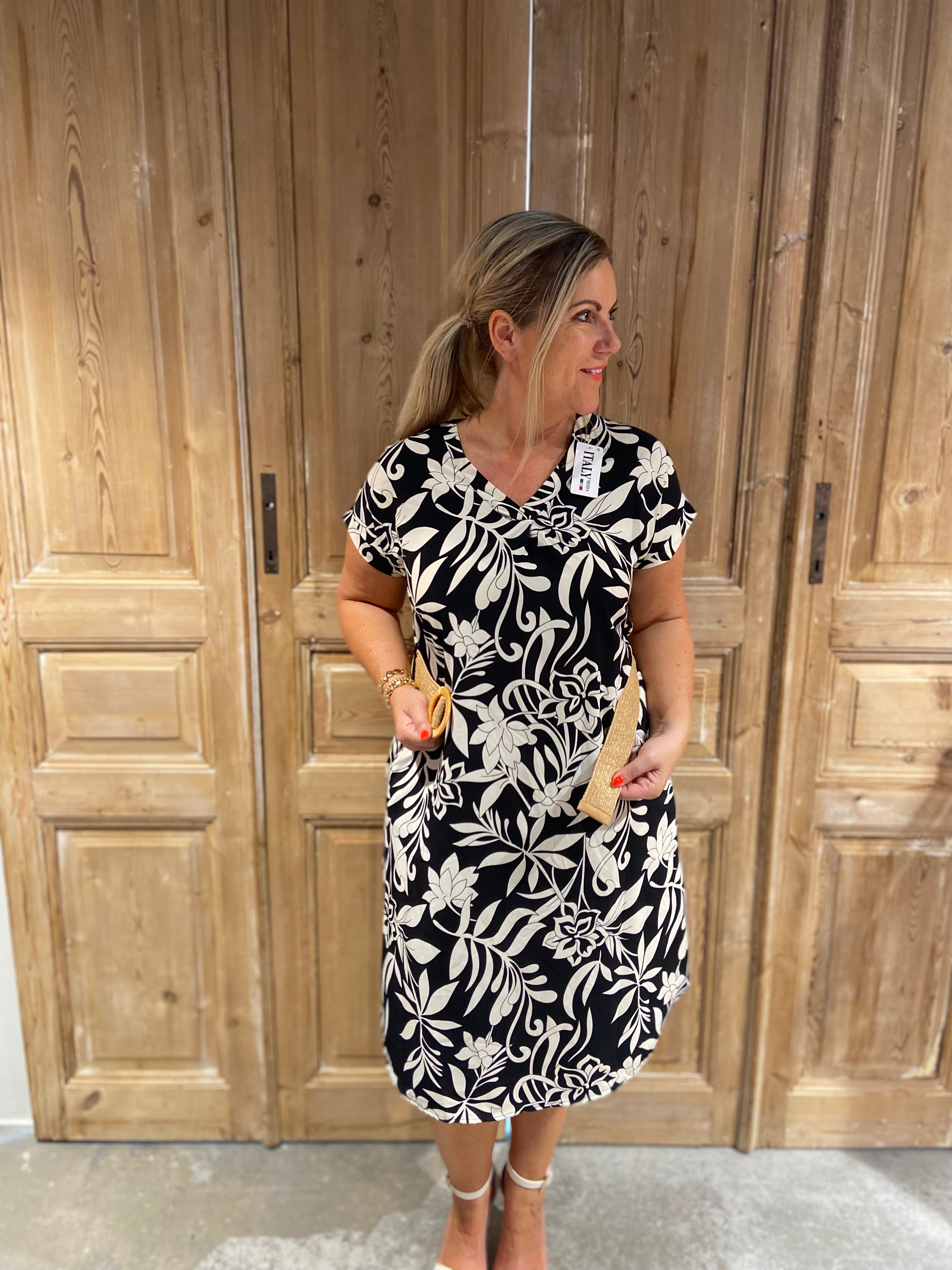 Een mooie jurk met een gratis riem! De jurk heeft een v-hals en kleine steekzakjes.