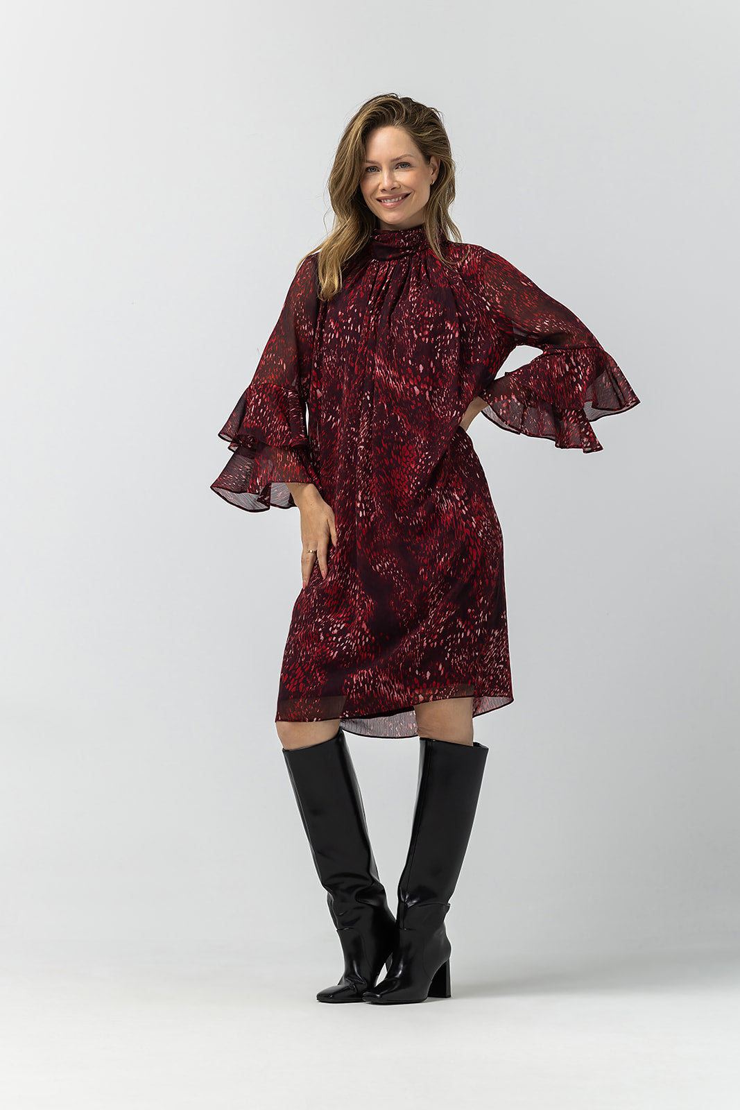 Op zoek naar een pronkstuk voor in jouw garderobe? Deze jurk van voile in warme roodtinten is precies wat je zoekt. De gelaagde volantmouwen en het subtiele stippenpatroon zorgen voor een verfijnde, speelse uitstraling. Het verhoogde halsboordje maakt de look helemaal af.