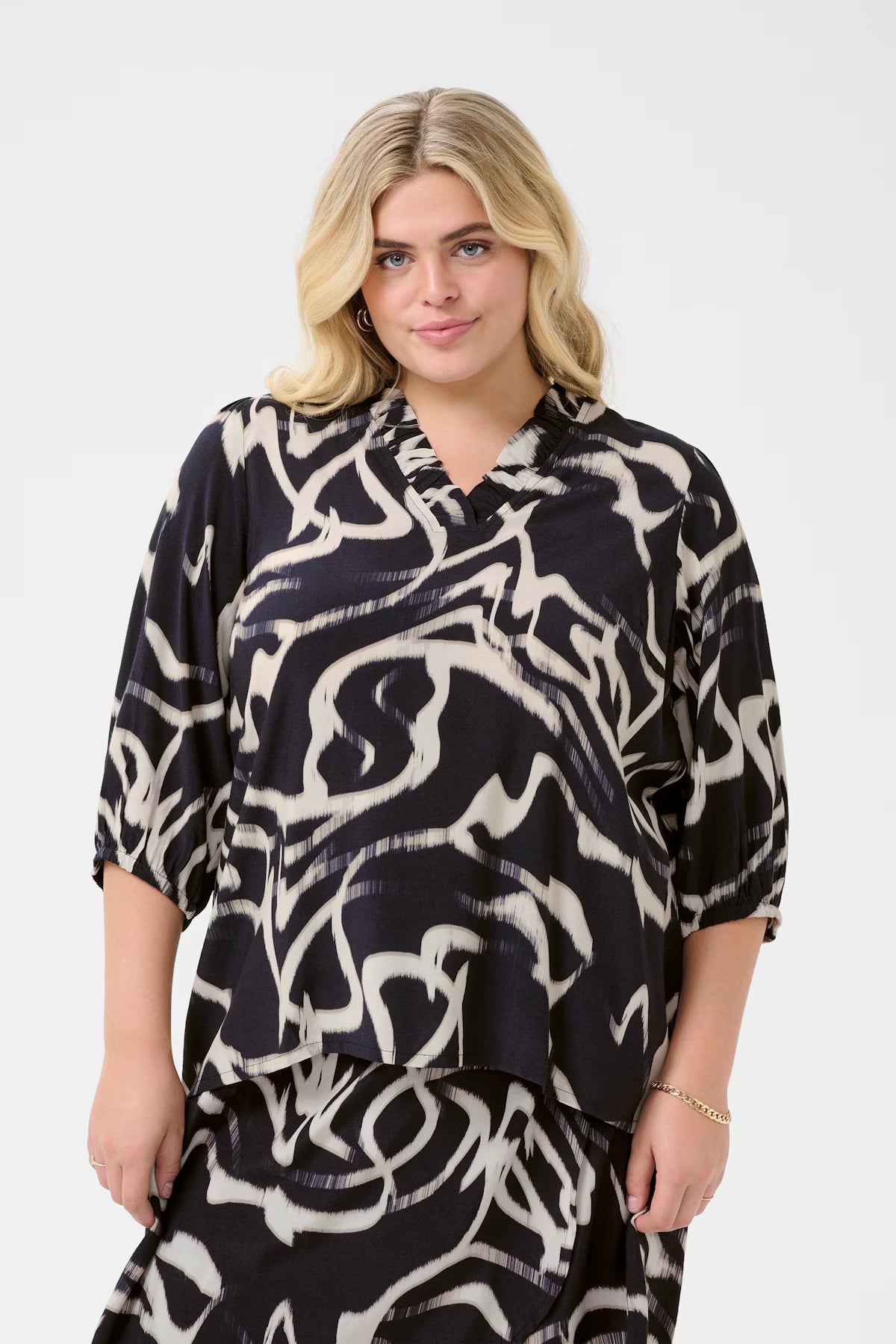 Deze damesblouse biedt een losse pasvorm met V-hals en driekwartmouwen. Het soepele materiaal zorgt voor draagcomfort. Stofsamenstelling 50% Viscose, 50% Viscose (LENZING™ ECOVERO™)
