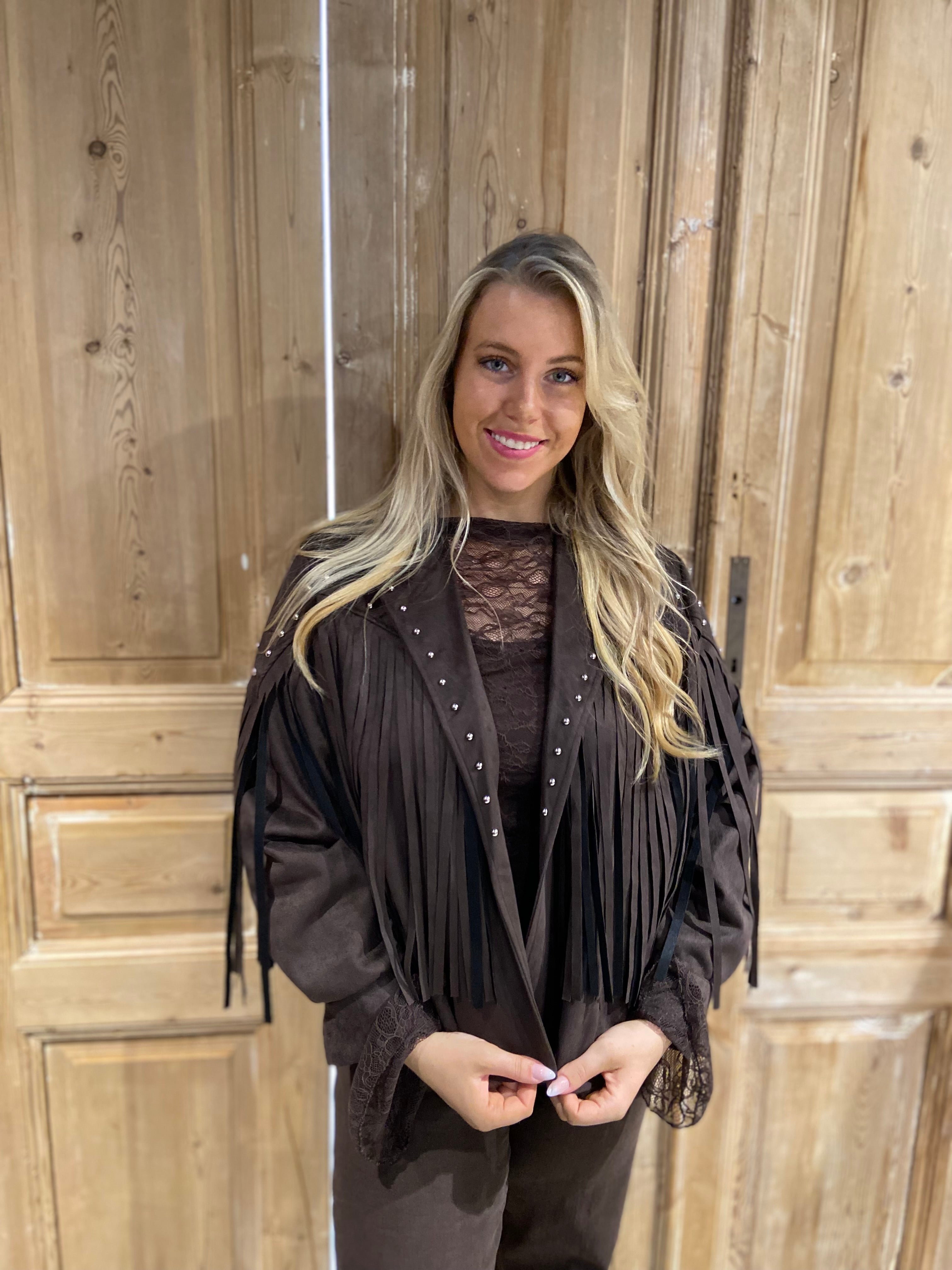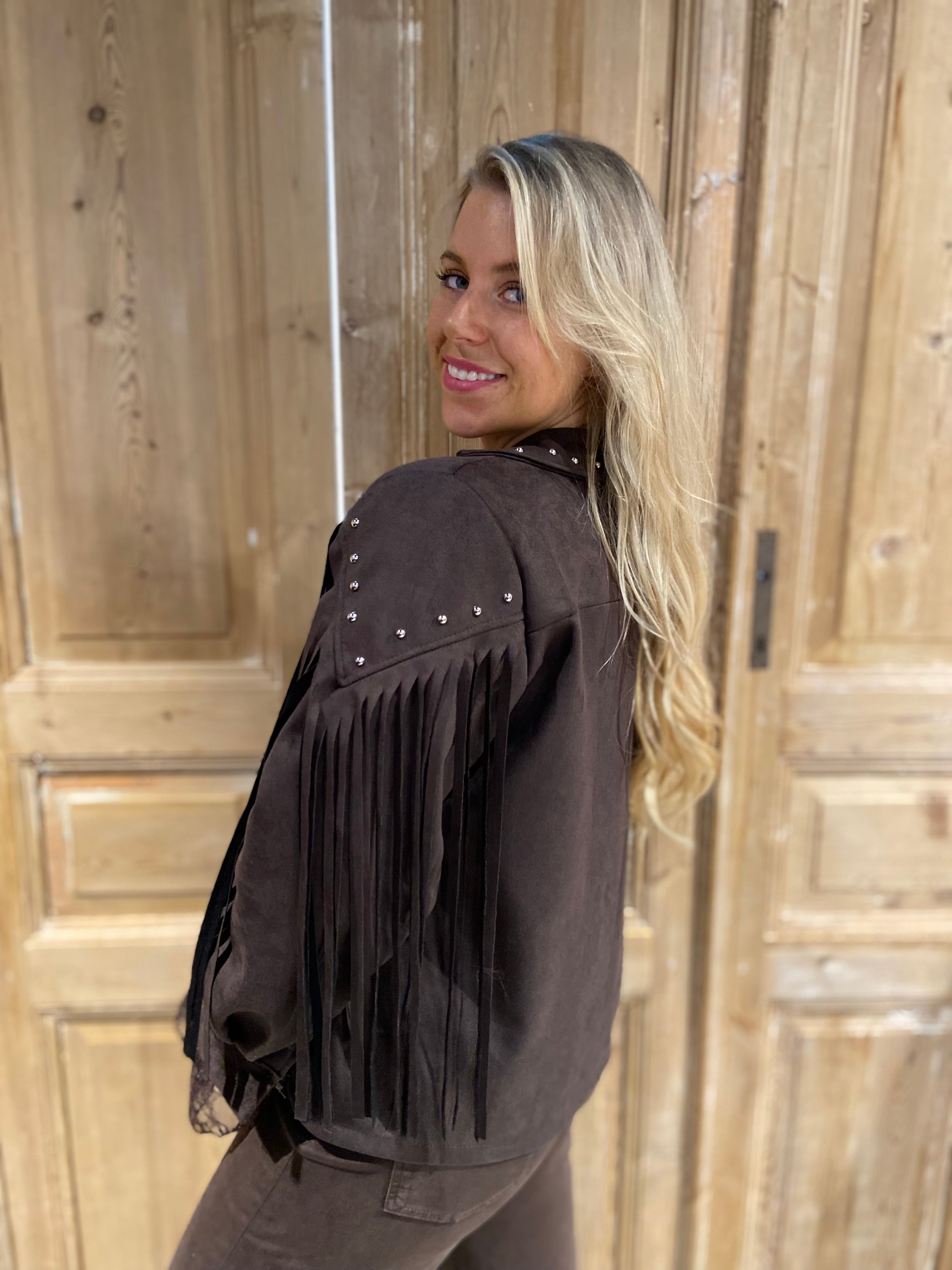 Dit mooie suedine look jasje past van maat 38 t/m 44.
