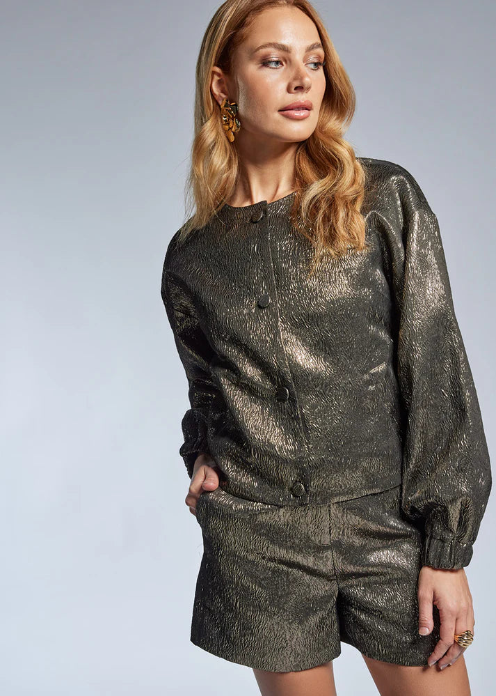 Het jasje is uitgevoerd in een rijke woven jacquard kwaliteit met een subtiele structuur, wat zorgt voor een speels en chic effect. Het heeft een oversized pasvorm met knoopsluiting en een elastische band aan de achterkant, waardoor het comfortabel draagt en mooi in vorm blijft. Dit bomber jasje voegt moeiteloos een stijlvolle touch toe aan elke outfit – perfect voor een eigentijdse, modieuze look.