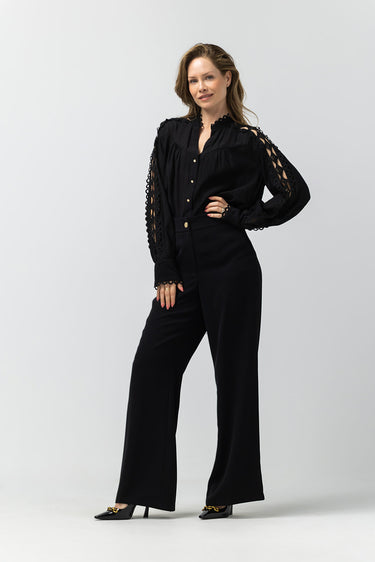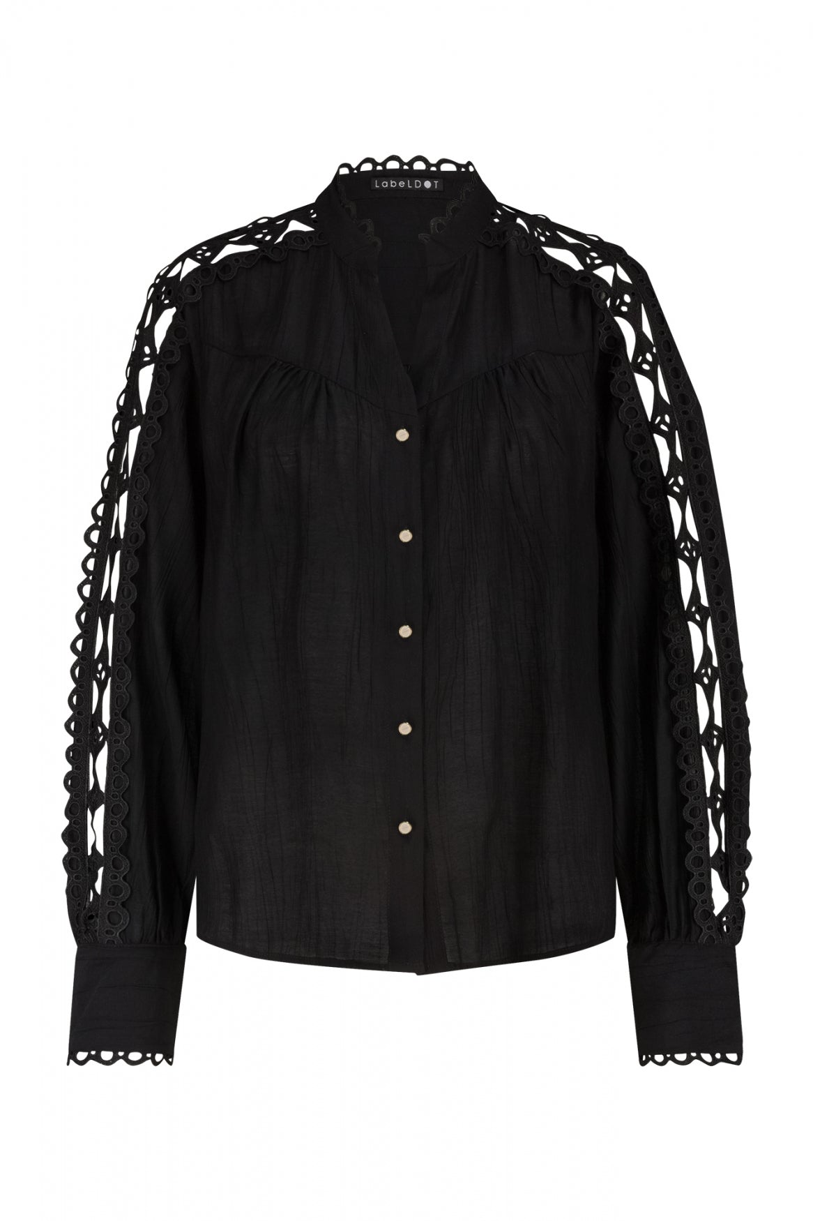 Deze prachtige blouse van viscose met opengewerkte, kantachtige arm- en schouderpartij is een echte eyecatcher. Afgewerkt met subtiele knoopjes en kantdetails op de manchetten, straalt het item elegantie en verfijning uit. Perfect voor een vrouwelijke, romantische look.