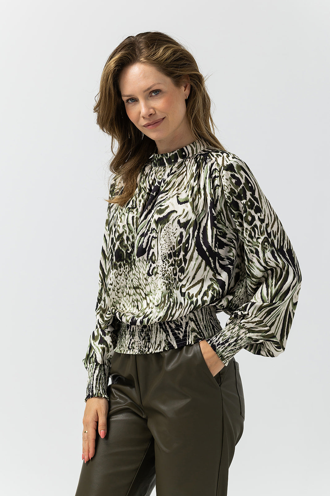 Geen standaard zebramotief! Deze satijnen top, met een klein opstaand kraagje en brede elastische boorden, valt op door het unieke dessin dat speelt met zebra- en panterinvloeden. Een grafisch statement waarmee je elke look een opvallende twist geeft.