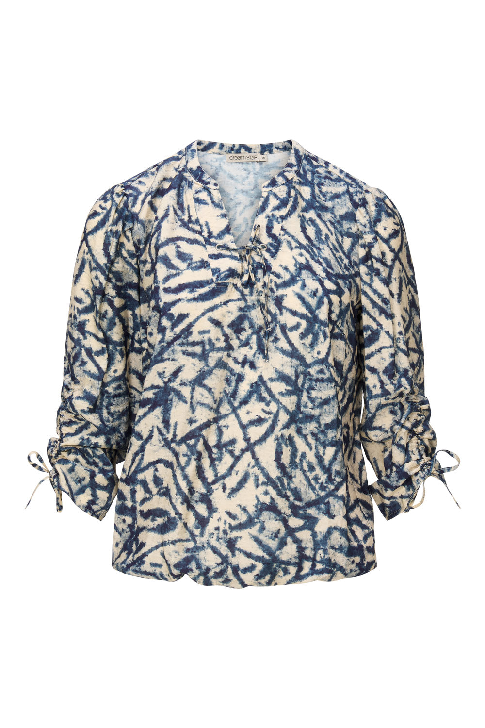 Deze luchtige blouse heeft een speelse all-over print en is voorzien van een v-hals met sierkoord. De lange mouwen zijn afgewerkt met een strikdetail, wat zorgt voor een vrouwelijke touch. Dankzij de elastische band aan de onderzijde valt de blouse mooi op de heup.