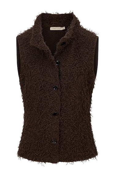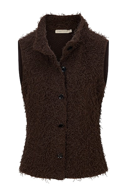 Een mooi mouwloos vestje met kleine franjes. een kraagje en knopen aan de voorkant.