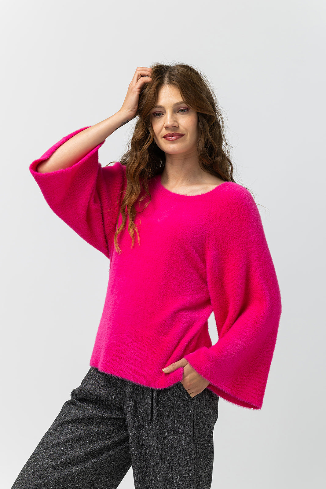 Voeg wat kleur toe aan je look met deze fluffy trui in knalroze. De trui heeft uitlopende driekwartmouwen voor een speelse uitstraling. Het zachte materiaal zorgt voor ultiem comfort, terwijl de levendige kleur je outfit helemaal opvrolijkt.