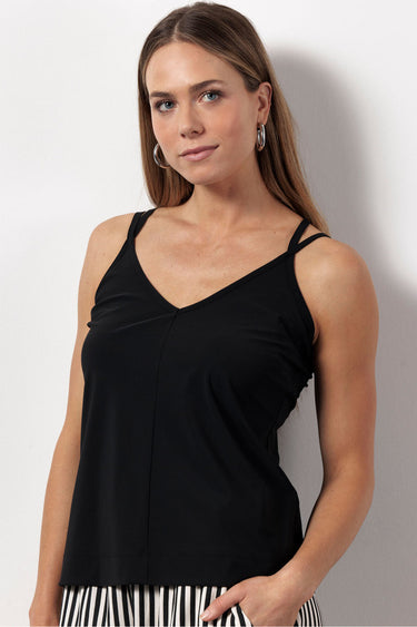 Het Gwenn singlet van Studio Anneloes is een elegante basic met een speelse achterkant. De v-hals en het mouwloze ontwerp zorgen voor een vrouwelijke uitstraling, terwijl de gekruiste bandjes op de rug voor een verrassend accent zorgen.