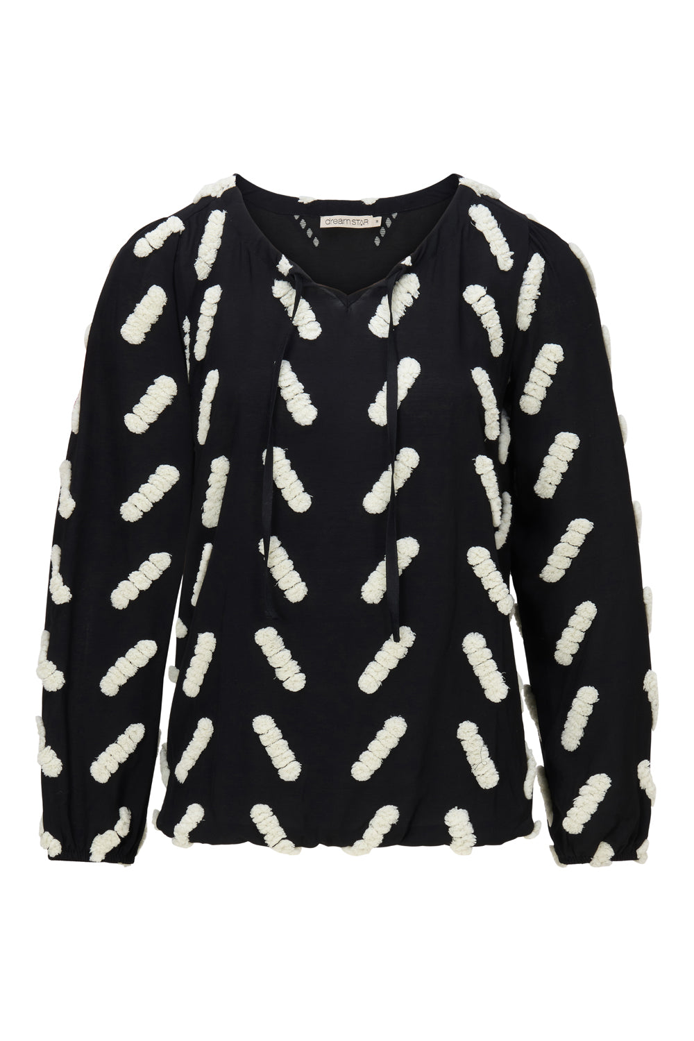 Een mooie Dreamstar blouse met relief. De offwhite delen liggen er dik bovenop, als een soort langwerpige pompoenen, heel mooi (al zijn ze niet helemaal offwhite maar een beetje groenig). De ronde hals heeft een strikje voor en er zitten elastieken in de zoom van de mouw en lijf. Valt normaal, maar er zit geen rek in de stof en houdt rekening met een beetje krimp, dus pak hem niet te klein.