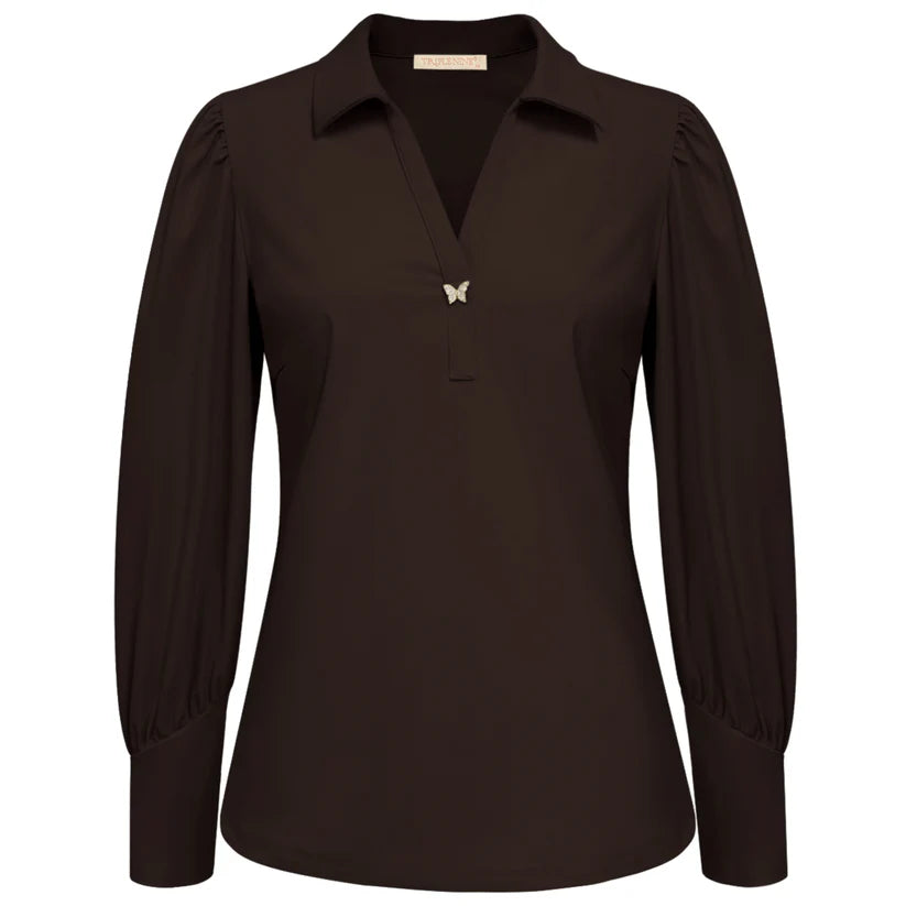 Een top van Triple Nine met kraag en v-hals welke eindigt met een vlinder knoopje. De top heeft licht poffende mouwen met manchetten. Dit artikel van top kwaliteit travelstof is een aanvulling op je garderobe en geeft een klassieke touch. Stofsamenstelling: 76% Polyamide en 24% Elastaan.