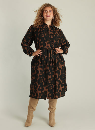 Deze blousejurk van Yesta is gemaakt van een zachte viscosemix en valt heerlijk soepel. Het dierenprintpatroon geeft hem een krachtige look, terwijl de stoffen riem een mooie, verstelbare taille creëert. Met wijde mouwen en een midi-lengte die tot net boven de knie valt, is hij een veelzijdige favoriet voor vele gelegenheden. Stofsamenstelling: 85% Viscose en 15% Nylon.