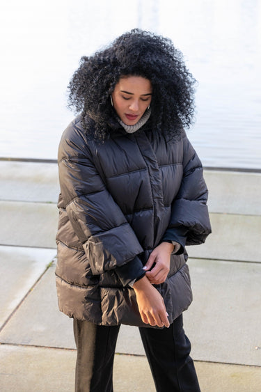 Deze warme winterjas heeft een doorgestikt design en een hoge opstaande kraag voor extra bescherming tegen de kou. Het wijdere model biedt veel bewegingsvrijheid, terwijl de elastische manchetten de warmte vasthouden. De matglanzende stof is waterafstotend, ideaal voor winterse omstandigheden. De jas is voorzien van handige steekzakken en heeft een stijlvolle zwarte kleur.