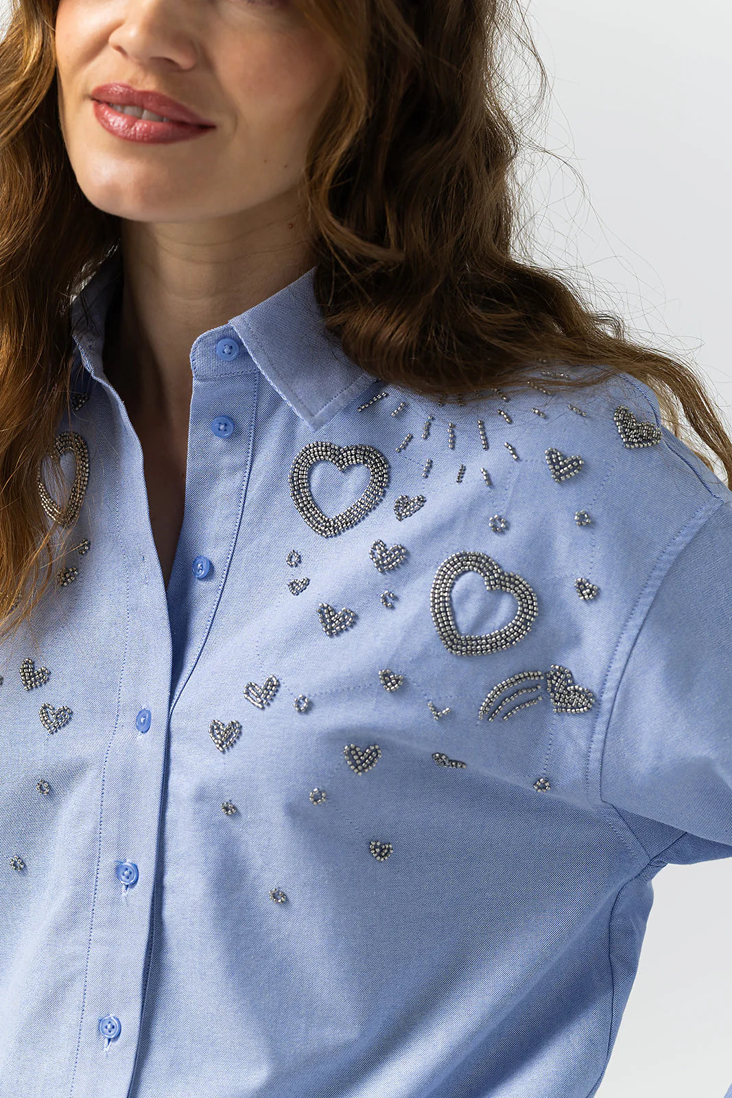 Met recht een favoriet! Deze katoenen blouse steelt de show met zilverkleurige kraaltjes op het voorpand en een vrouwelijke tunnelceintuur onderaan. De verfijnde details maken ’m bijzonder – niet voor niets het best verkochte item van onze najaarscollectie. 100% katoen