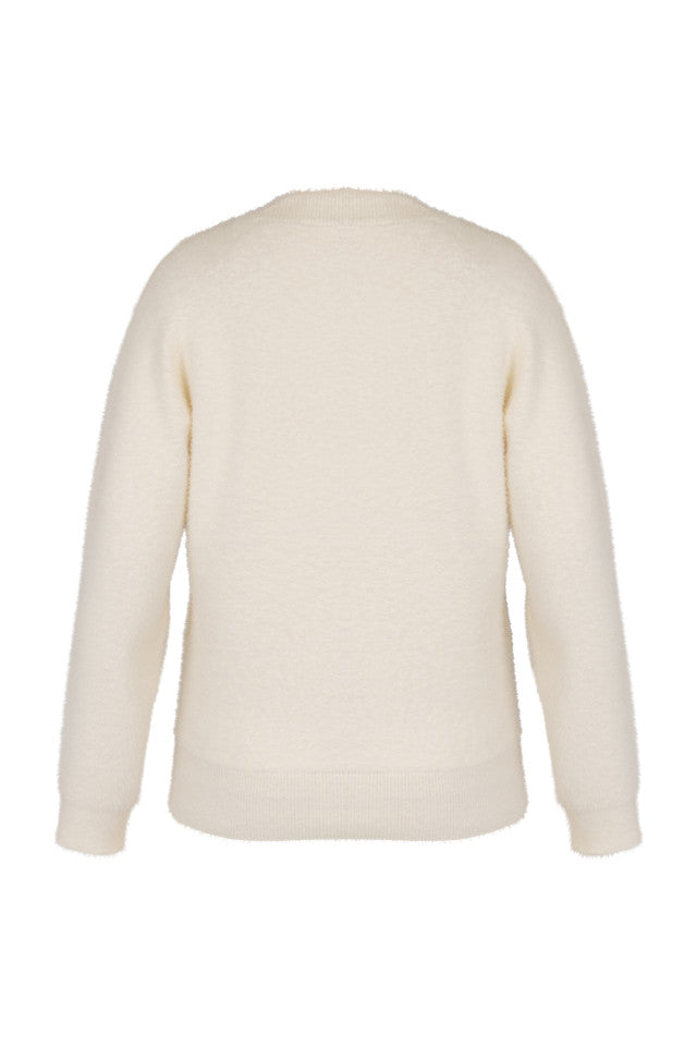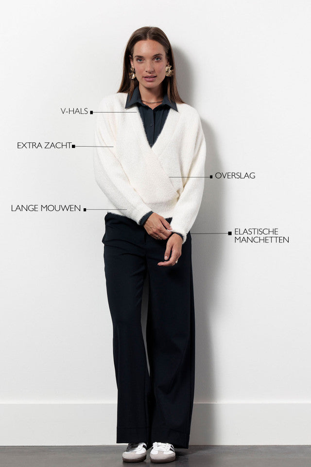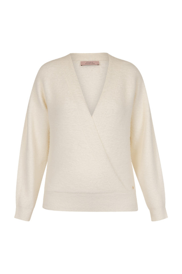De Nuri wrap pullover van Studio Anneloes is een zachte knit met een vrouwelijke twist. De kleur Ecru geeft je look een frisse, lichte basis en straalt verfijning uit. Het overslagmodel creëert een elegant silhouet, terwijl de harige structuur zorgt voor een comfortabel en speels effect. stofsamenstelling: 79% Polyamide, 13% Viscose en 8% Polyester.