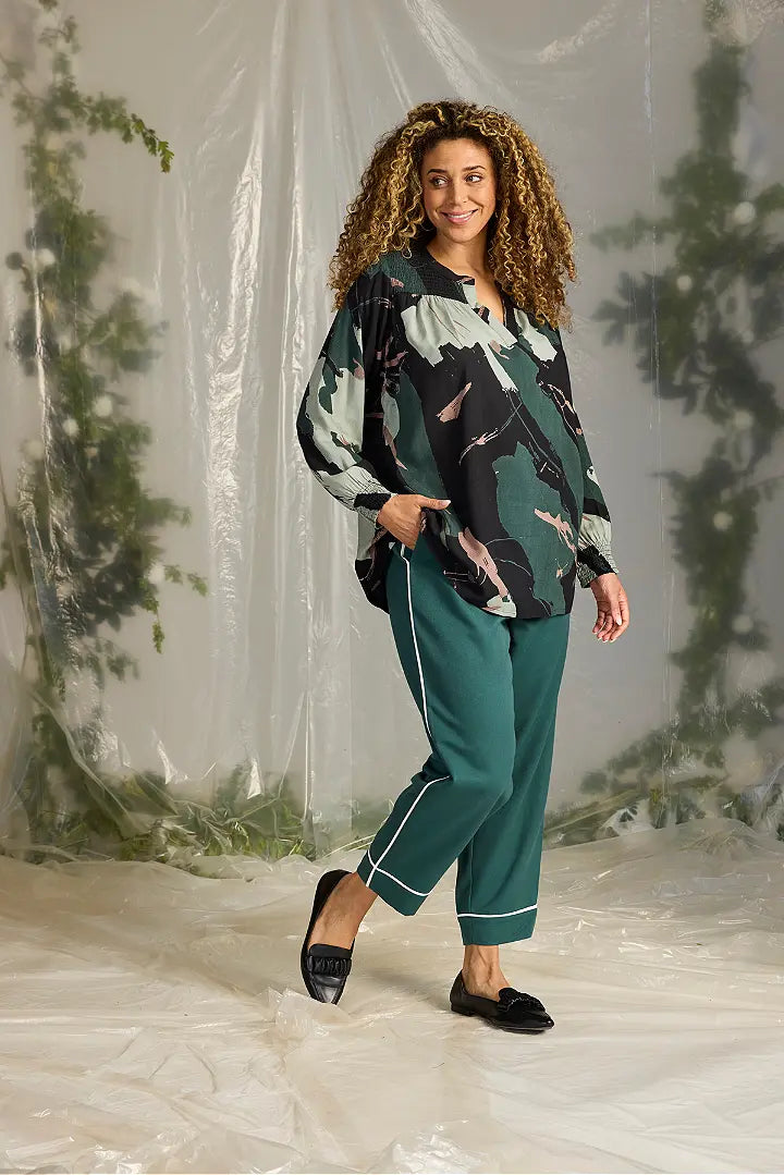 ANITY 1205 is een stijlvolle blouse van zachte viscose met een artistieke print en subtiel glanzende stippen die het licht op een elegante manier vangen. Het ontwerp heeft een vrouwelijke V-hals en smockdetails aan de voorkant en mouwboorden, wat zorgt voor structuur en een comfortabele pasvorm.